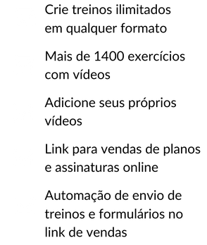 Crie Treinos ilimitados Venda de planos online Avaliação Física +de 1400 exercícios com vídeo.